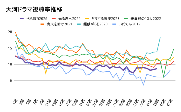 次に、2025年大河ドラマ『べらぼう』の視聴率推移を直近の大河ドラマと比較してみます。